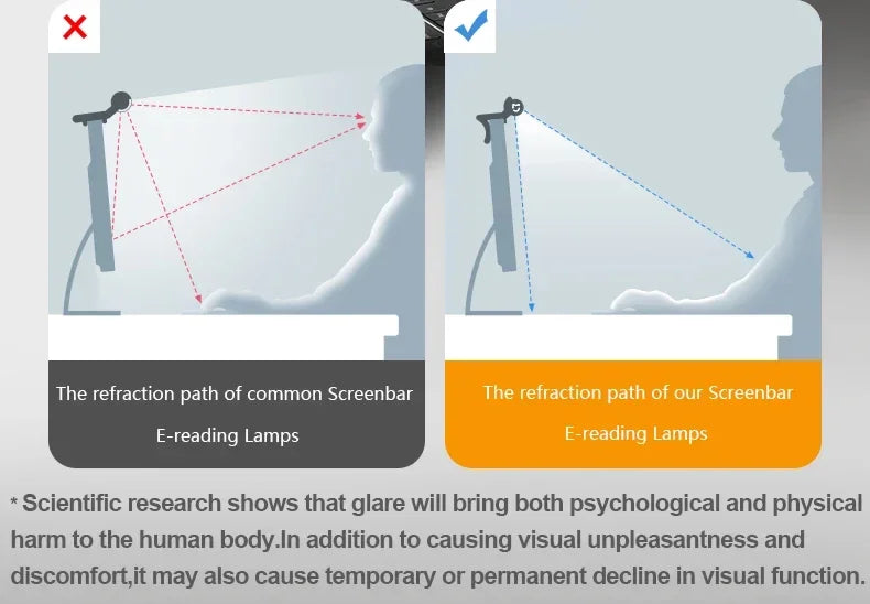 1. Computer monitor light with asymmetrical optical design, it only illuminates the desk and eliminates reflective glare off the screen, effectively protect your eyes in daily life.