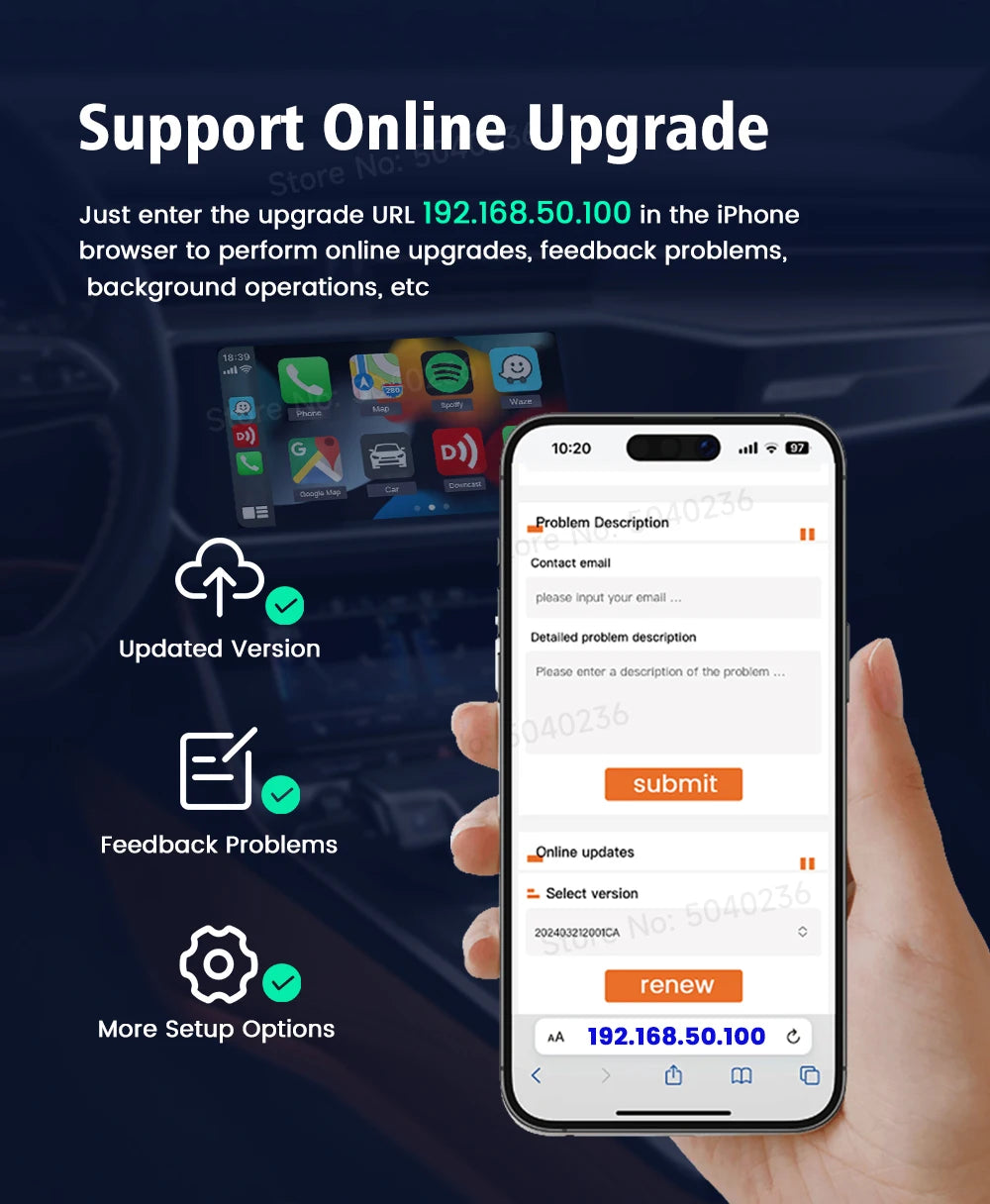 Just enter the upgrade URL 192.168.50.100 in the mobile browser to perform online upgrades, feedback problems, background operations, etc.