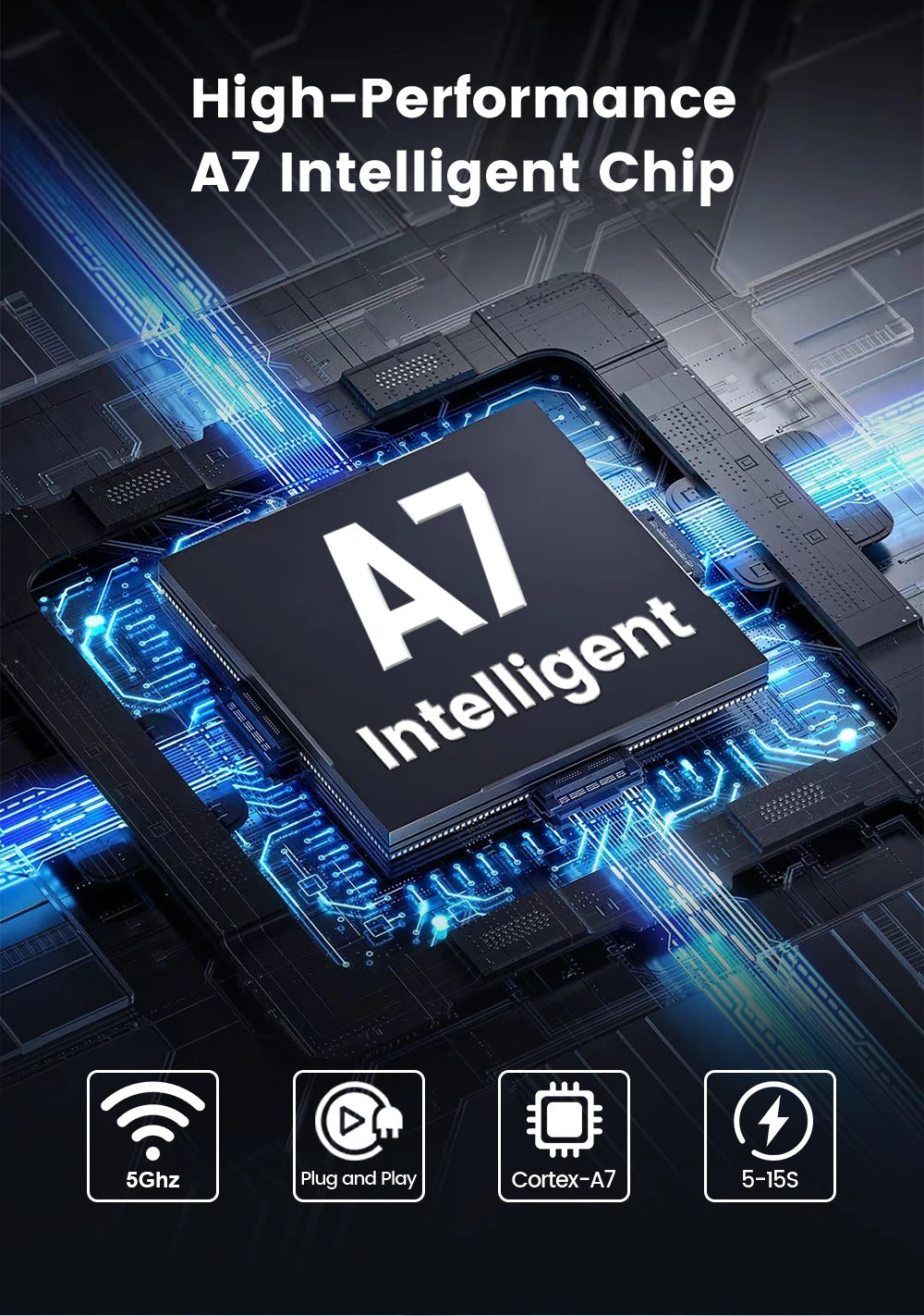 Built-in A7 chip, equipped with 5GHZ WiFi, 5.0 Bluetooth , which increases data transfer rate by more than 40%, transferring Google Maps, media and messaging apps to your car display 10 times faster than other apps. The unique A7 chip maintains excellent performance in anti-oxidation, hardness, corrosion and temperature tests (-20°C to 65°C). No need to worry about disconnection when driving for a long time